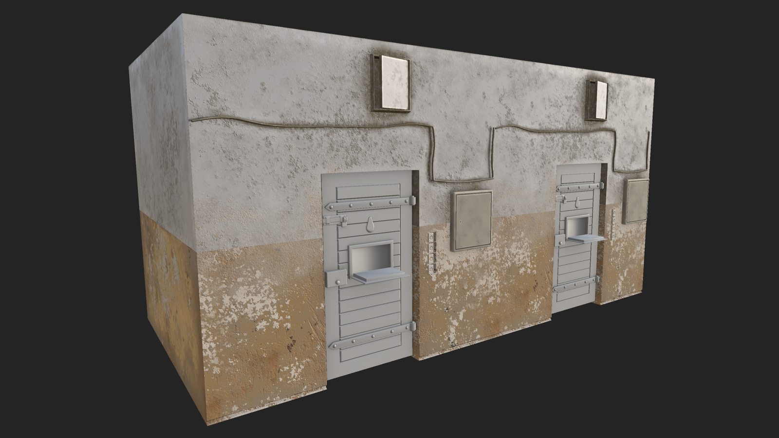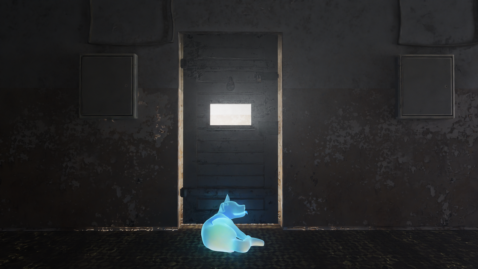 The project includes a realism-focused prison environment and a stylized character element: Gorinov’s dog, who died while waiting for his return, reimagined here as a softly glowing presence outside the cell door. The corridor and cell exterior form a bleak prison passage, where worn surfaces and utilitarian materials define the space across shots. Light from Gorinov’s cell breaks through the corridor darkness, remaining stronger than it.