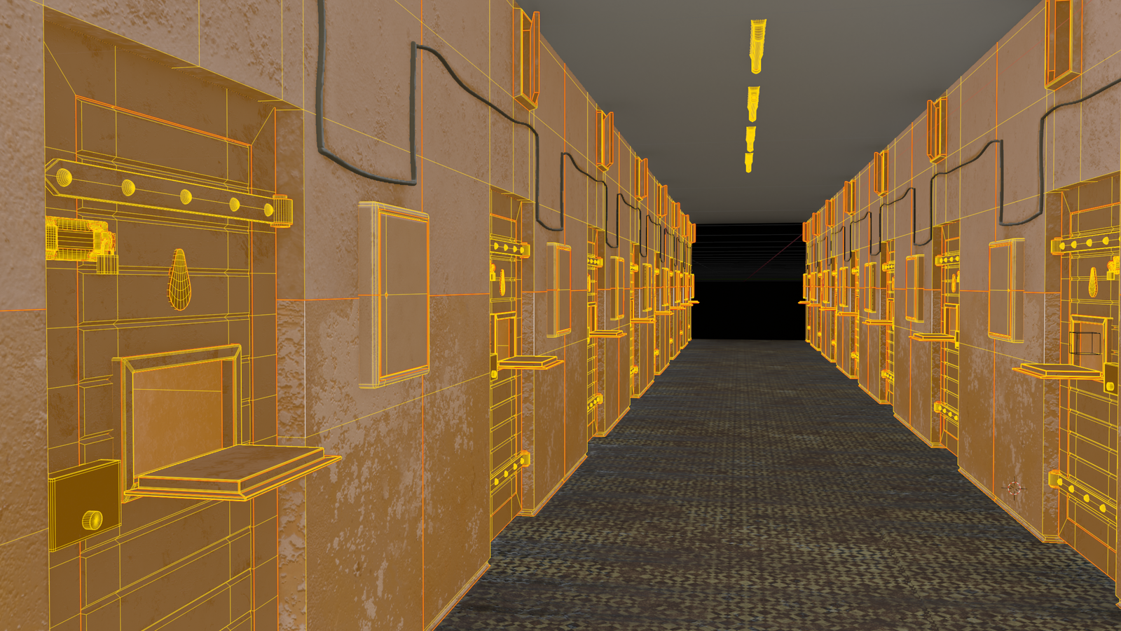 The corridor is built as a dark, monotonous prison space, defined by repetition and worn surfaces that compress the frame.