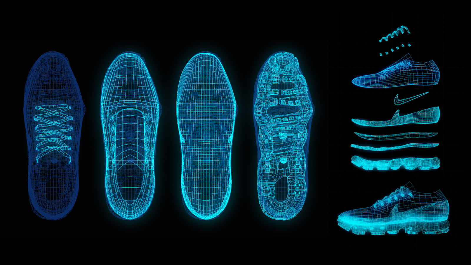 Each shoe is built from many distinct components — from lacing and inner parts to outsole elements and layered panels — so the AR experience can separate the model into an “exploded” view. It’s a way to present what the design is made of and why each part matters, in a clear, product-focused format.