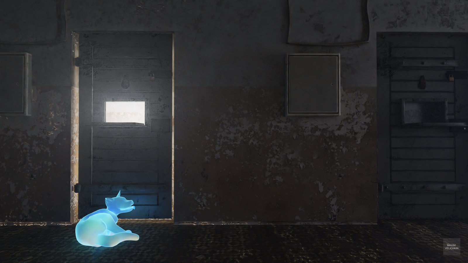 The project includes a realism-focused prison environment and a stylized character element: Gorinov’s dog, who died while waiting for his return, reimagined here as a softly glowing presence outside the cell door. The corridor and cell exterior form a bleak prison passage, where worn surfaces and utilitarian materials define the space across shots. Light from Gorinov’s cell breaks through the corridor darkness, remaining stronger than it.