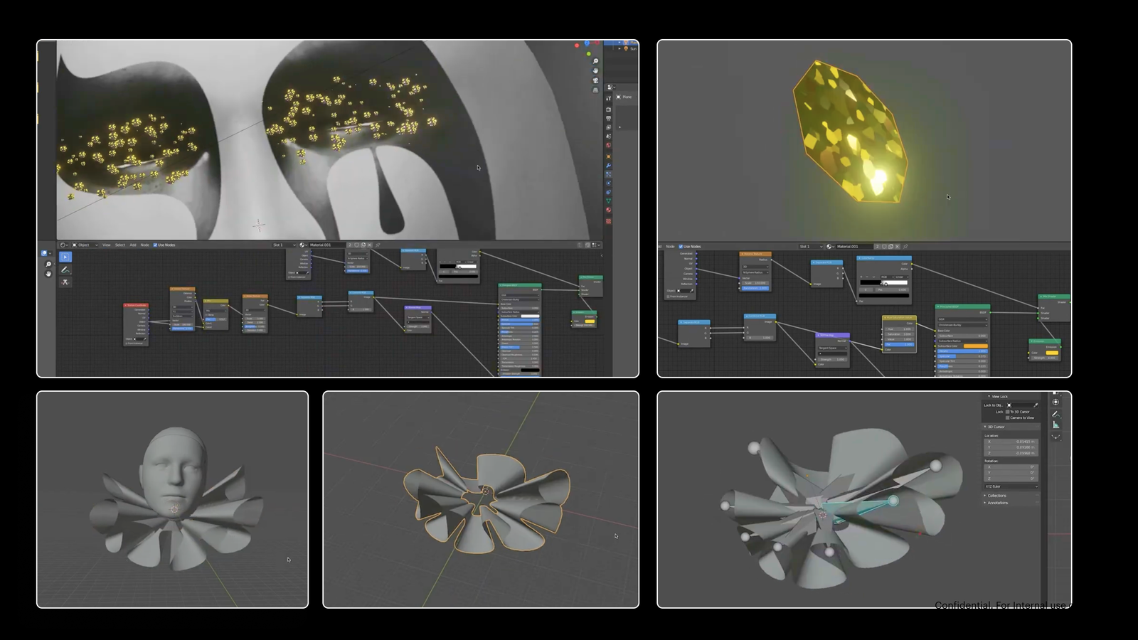 The eye-area glitter was built as an animated element with close attention to small highlights. Each piece began as an individual 3D object with a custom shader reacting to light sources, forming the final looping animation used as part of the makeup.