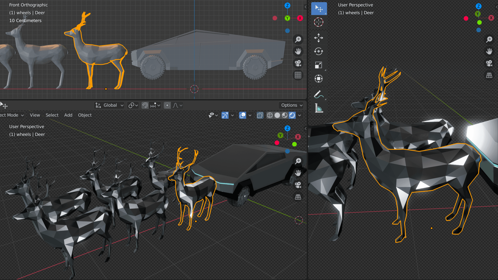 A low-poly reindeer team designed to match the vehicle’s language, with a rig built for coordinated motion. Each reindeer has its own skeletal controls, plus a higher-level system that links the whole chain — so turns and direction changes travel smoothly from the front pair through the lineup and into the vehicle, creating a sense of shared inertia.