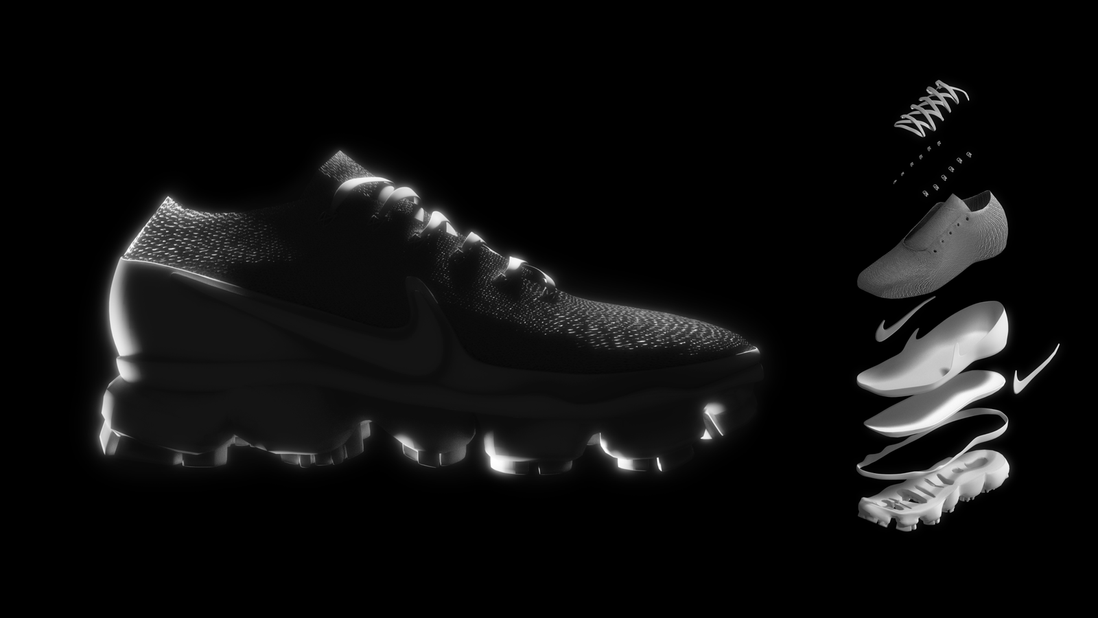 Each shoe is built from many distinct components — from lacing and inner parts to outsole elements and layered panels — so the AR experience can separate the model into an “exploded” view. It’s a way to present what the design is made of and why each part matters, in a clear, product-focused format.